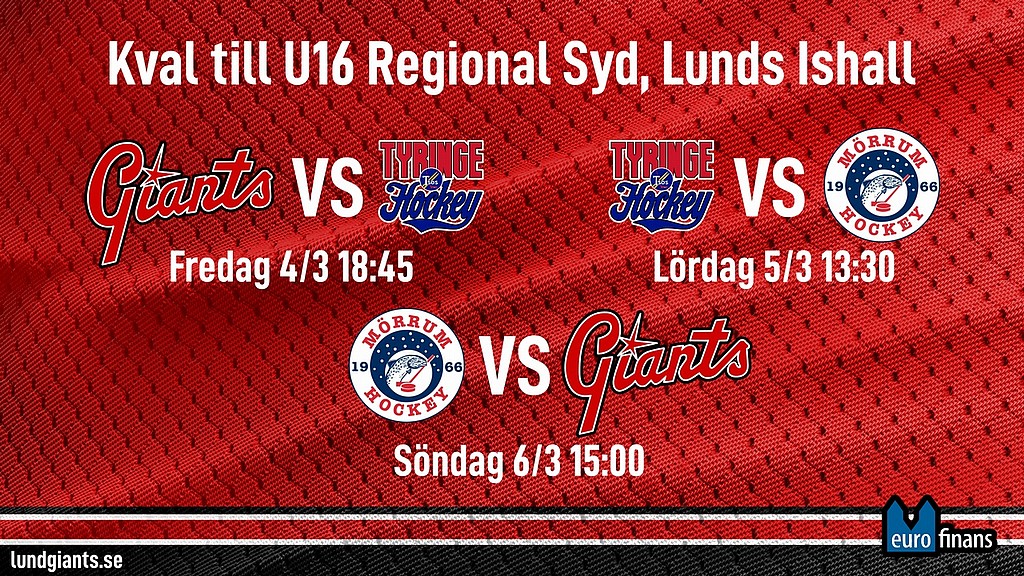 Lund Giants spelar i helgen kval för att behålla sin plats i U16Region. Motståndet består av Tyringe och Mörrum och matcherna kommer spelas under hela helgen där Lund spelar fredag och söndag. Matchtröja på kom och stötta Giants!